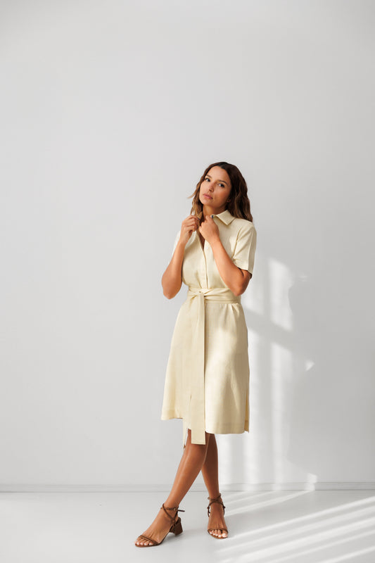 Chemise Manga Curta Linho Pregas Off Tapioca