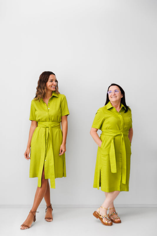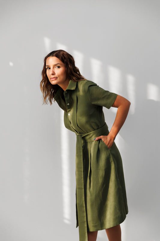 Chemise Manga Curta Linho Pregas Verde Militar