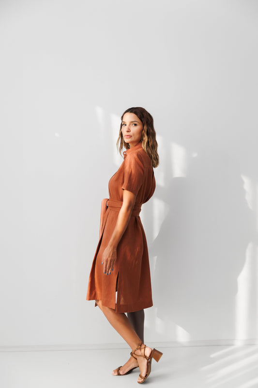 Chemise Manga Curta Linho Pregas Marrom