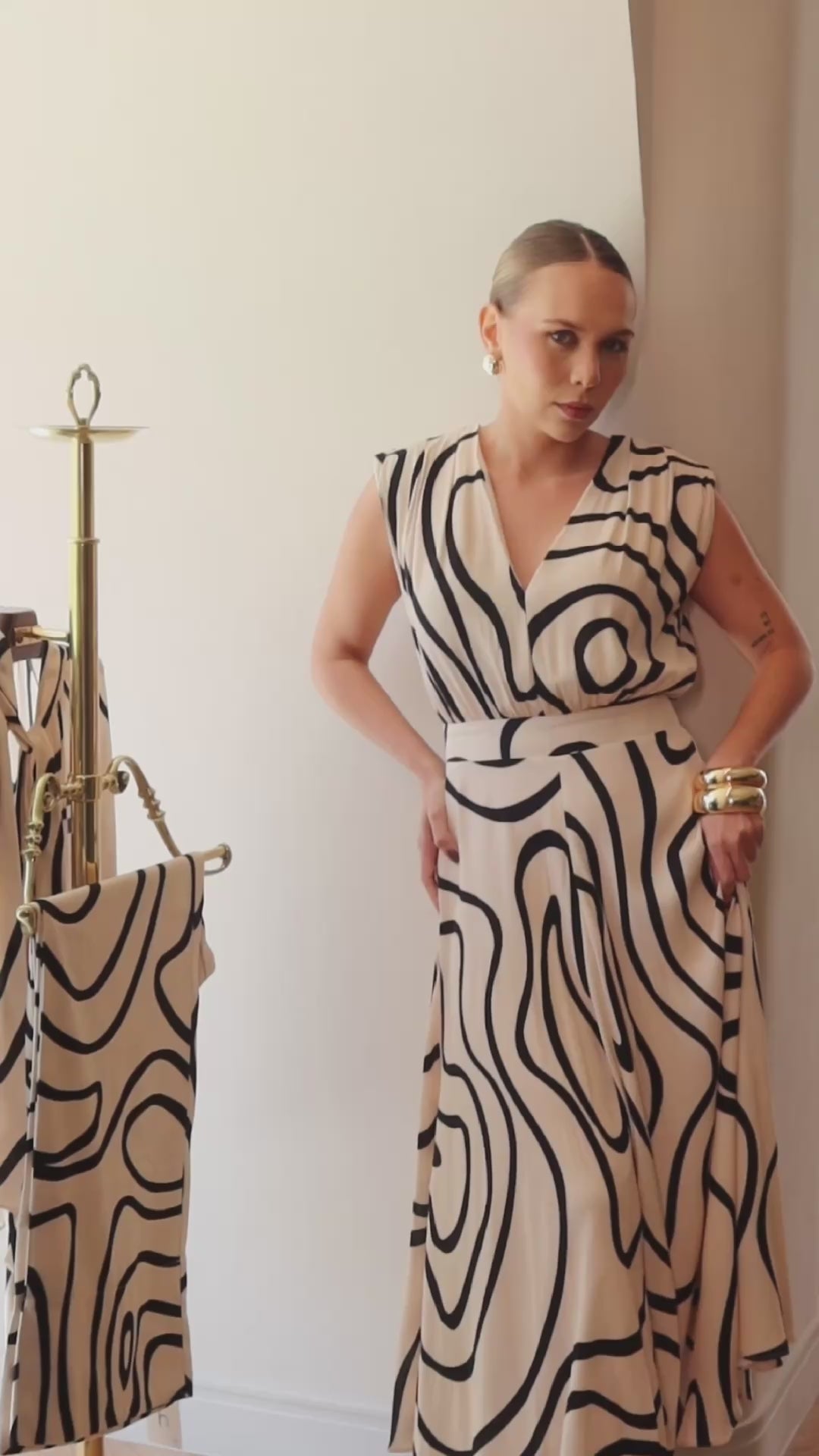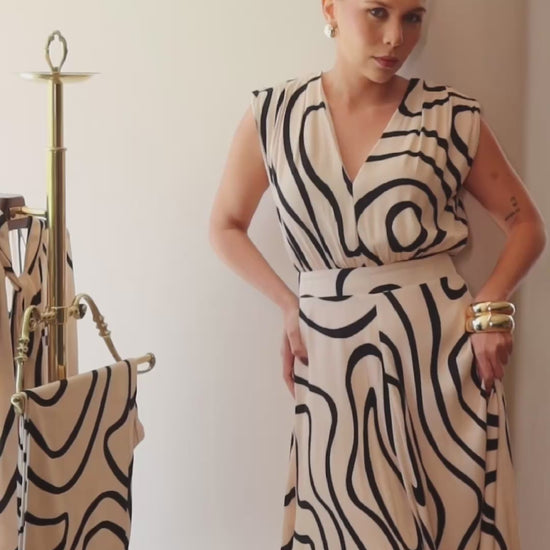 A estampa New Meandros é uma releitura da clássica Meandros, inspirada nas curvas dos rios amazônicos — símbolo de fluidez, força e beleza natural. O resultado é um vestido atemporal, moderno e extremamente feminino.